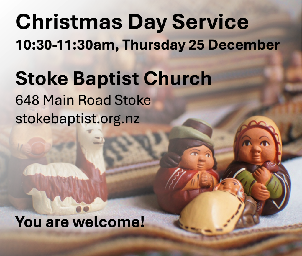We meet at Stoke Baptist Church, 648 Main Road Stoke, Nelson, NZ.